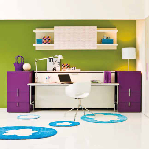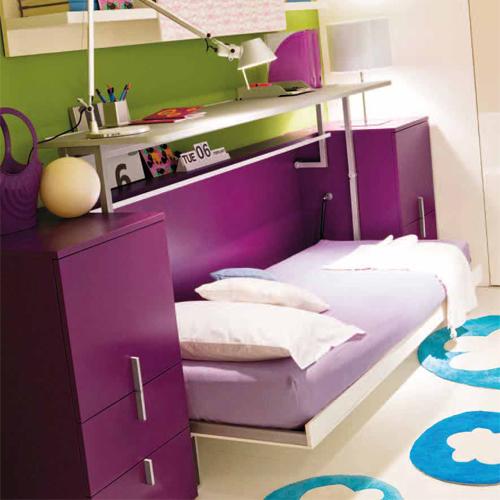 Cabrio In představuje kombinaci místa na práci a spaní. Centrální část se po zvednutí psací plochy promění v jednolůžko. Řešení vhodné pro studenty. Tento kus se nabízí v několika pastelových barvách.